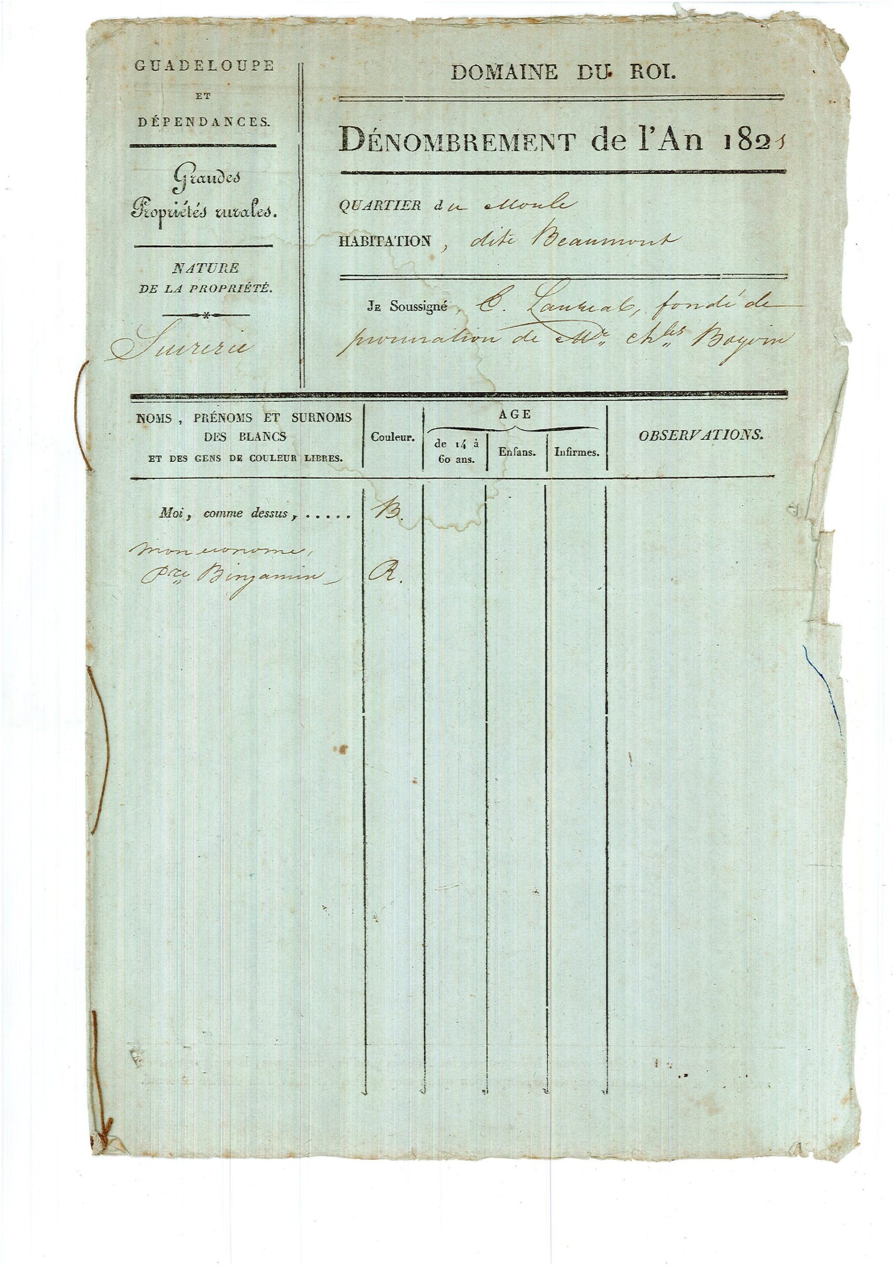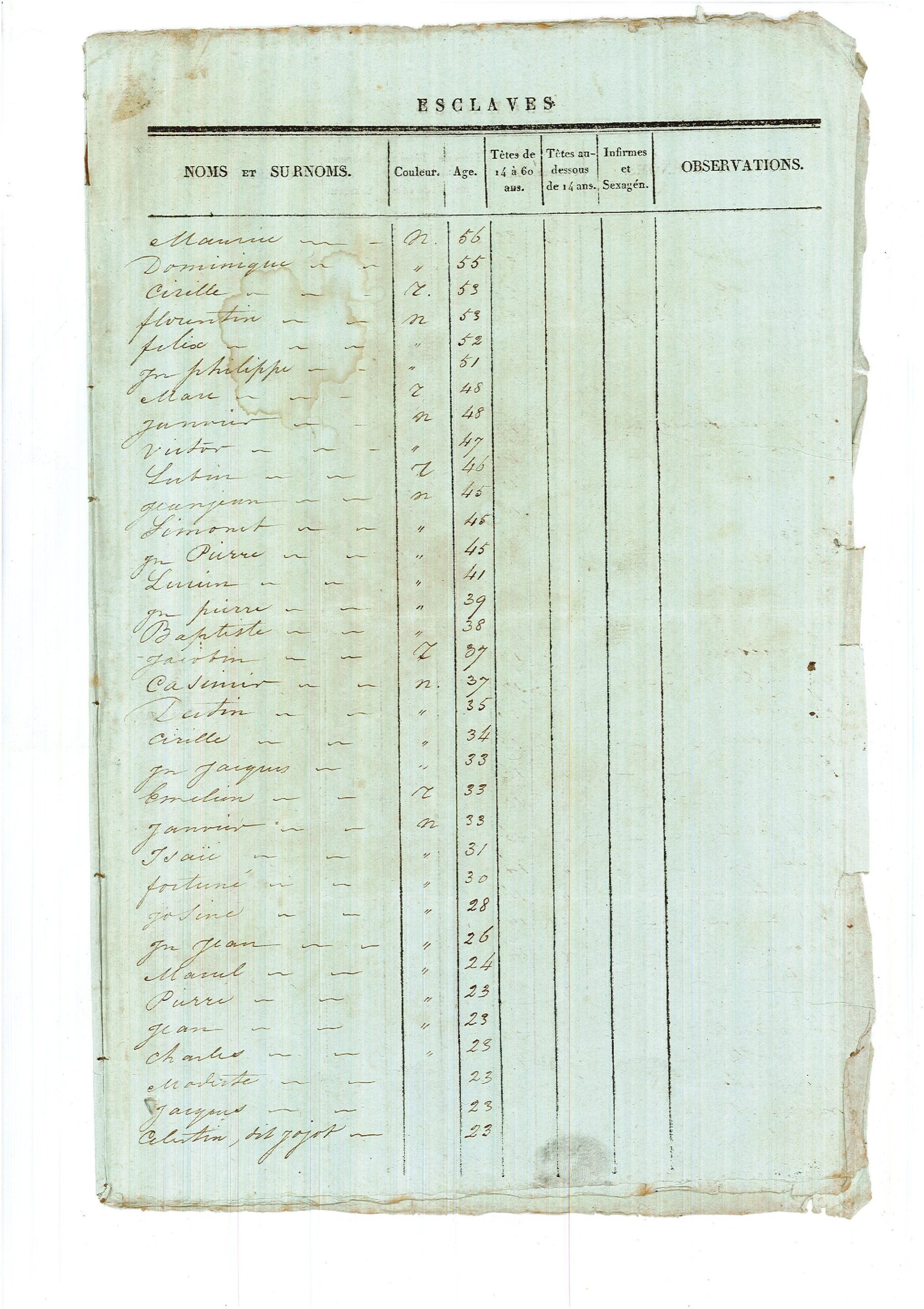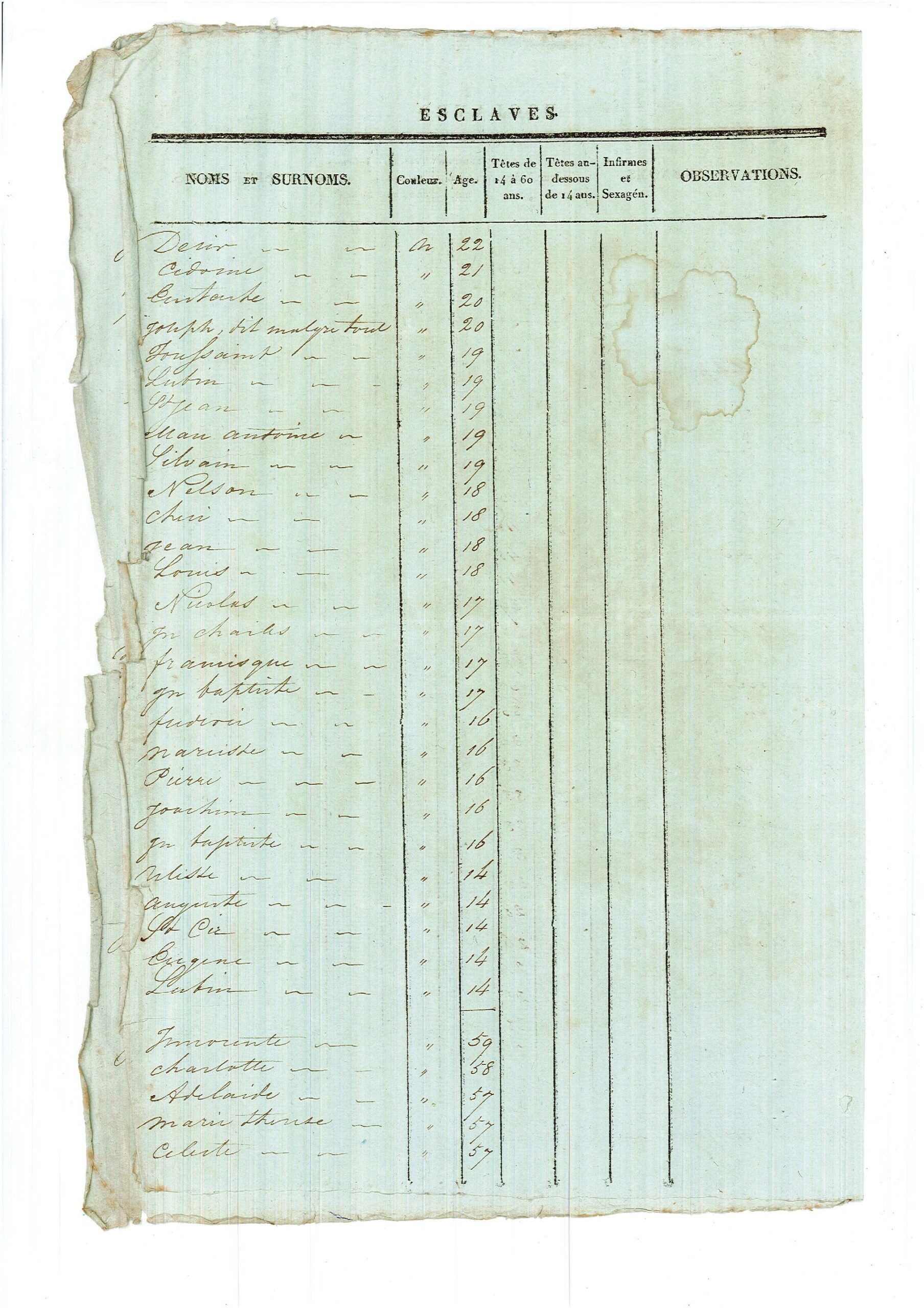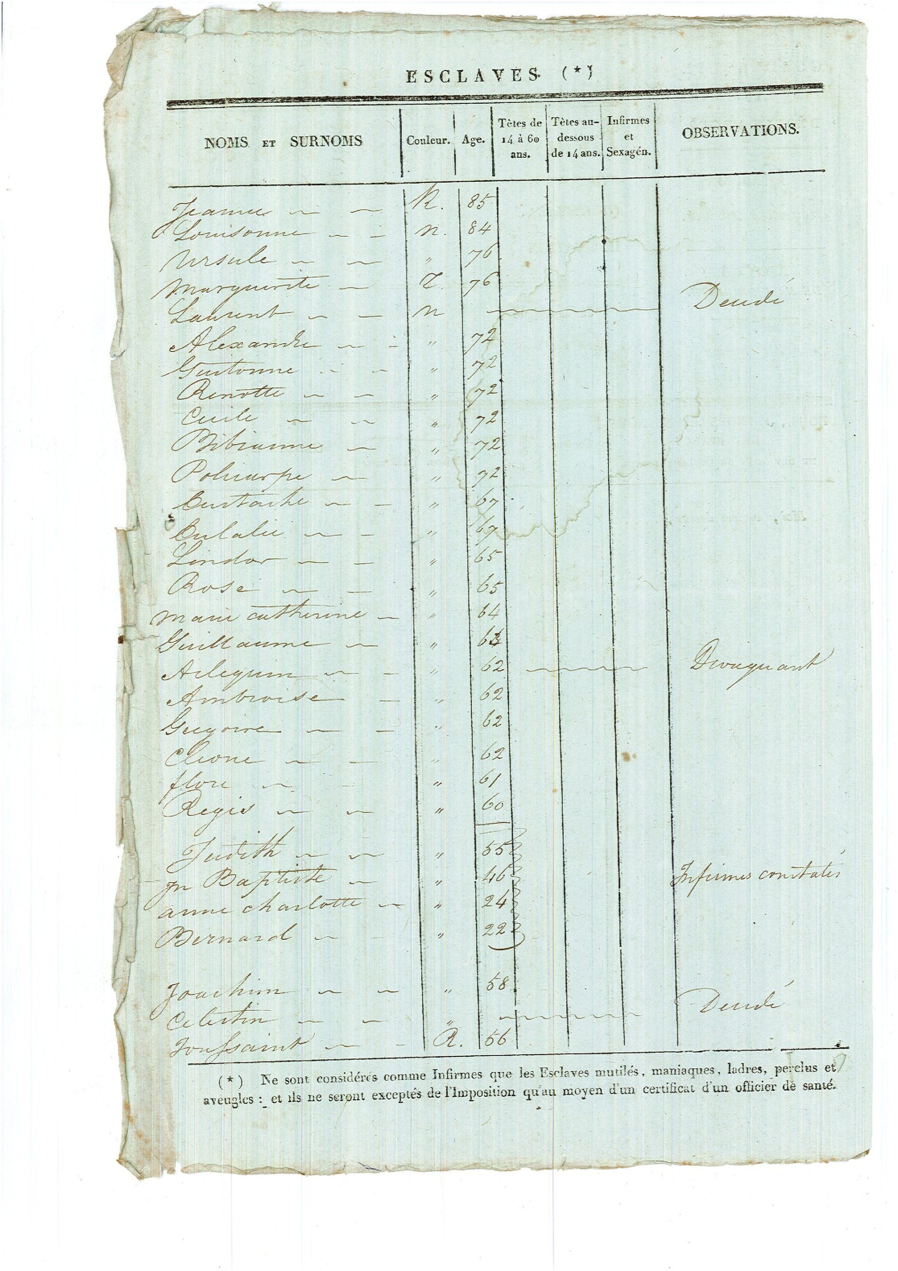 Parmi les archives qui constituent le fonds de l’habitation Boyvin dite Beaumont, il existe un autre document, moins spectaculaire que le plan parcellaire de 1817 (voir le focus précédent) mais tout aussi caractéristique du régime servile. Cette pièce est purement administrative, parfaitement anodine au sein d’une société coloniale fondée sur l’esclavage mais elle est aujourd’hui d’une réelle rareté aux Antilles car ces pièces n’ont pas été conservées sous cette forme. Il s’agit d’un dénombrement d’esclaves, un document que les propriétaires d’esclaves devaient remplir chaque année sur un formulaire spécifique avant de le remettre à l’administration, cette liste permettant ensuite aux autorités de fixer le montant de la contribution due par les détenteurs d’esclaves. Il s’agit d’un impôt de capitation, payé par « tête d’esclave » déclarée.