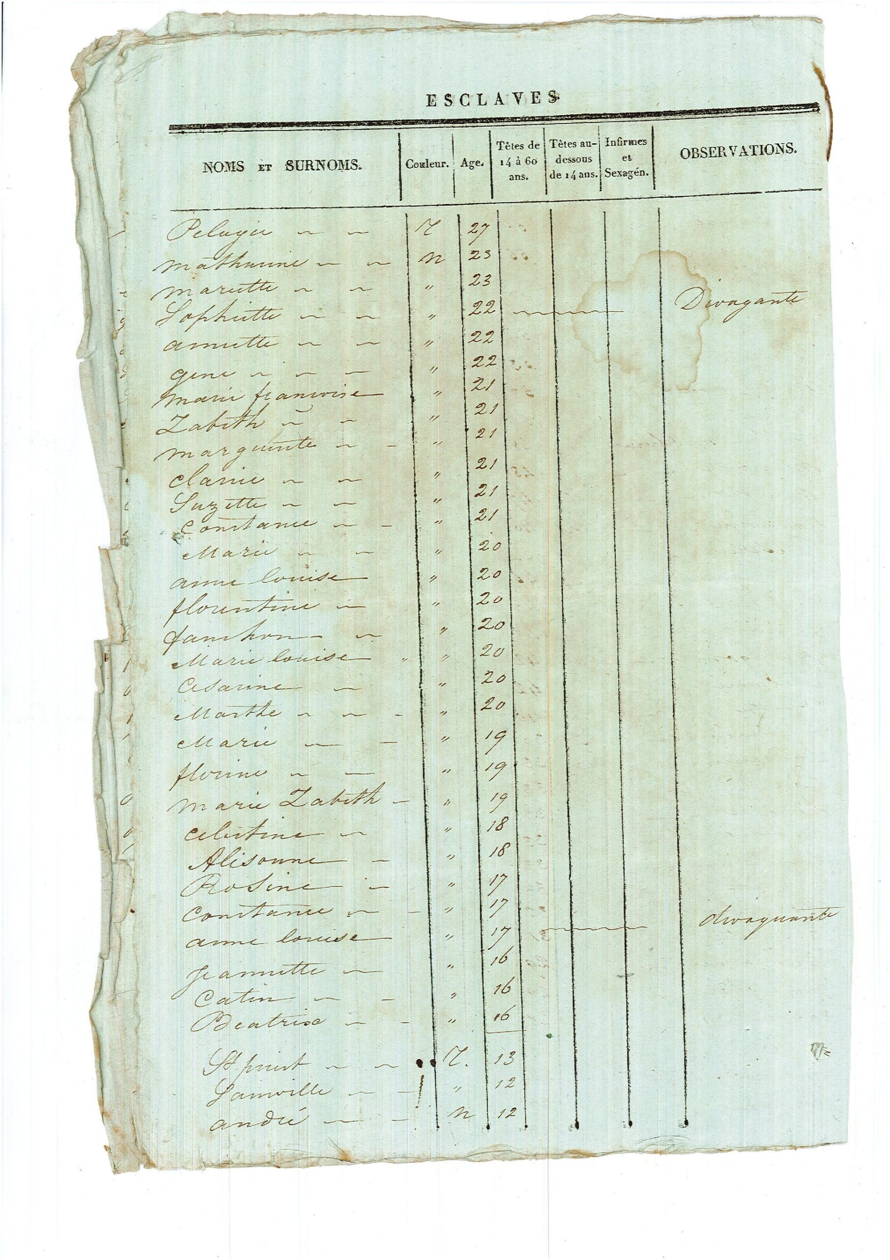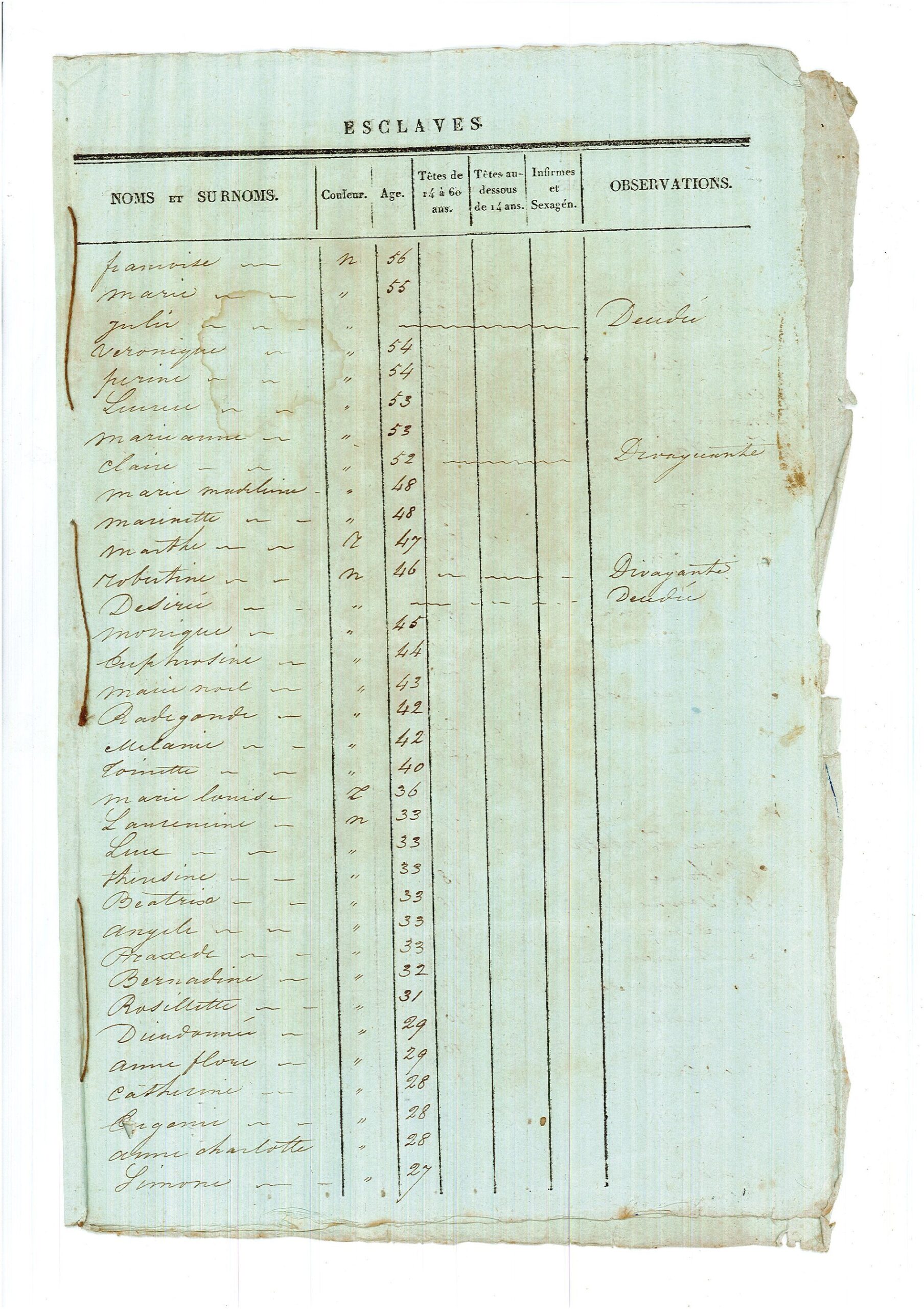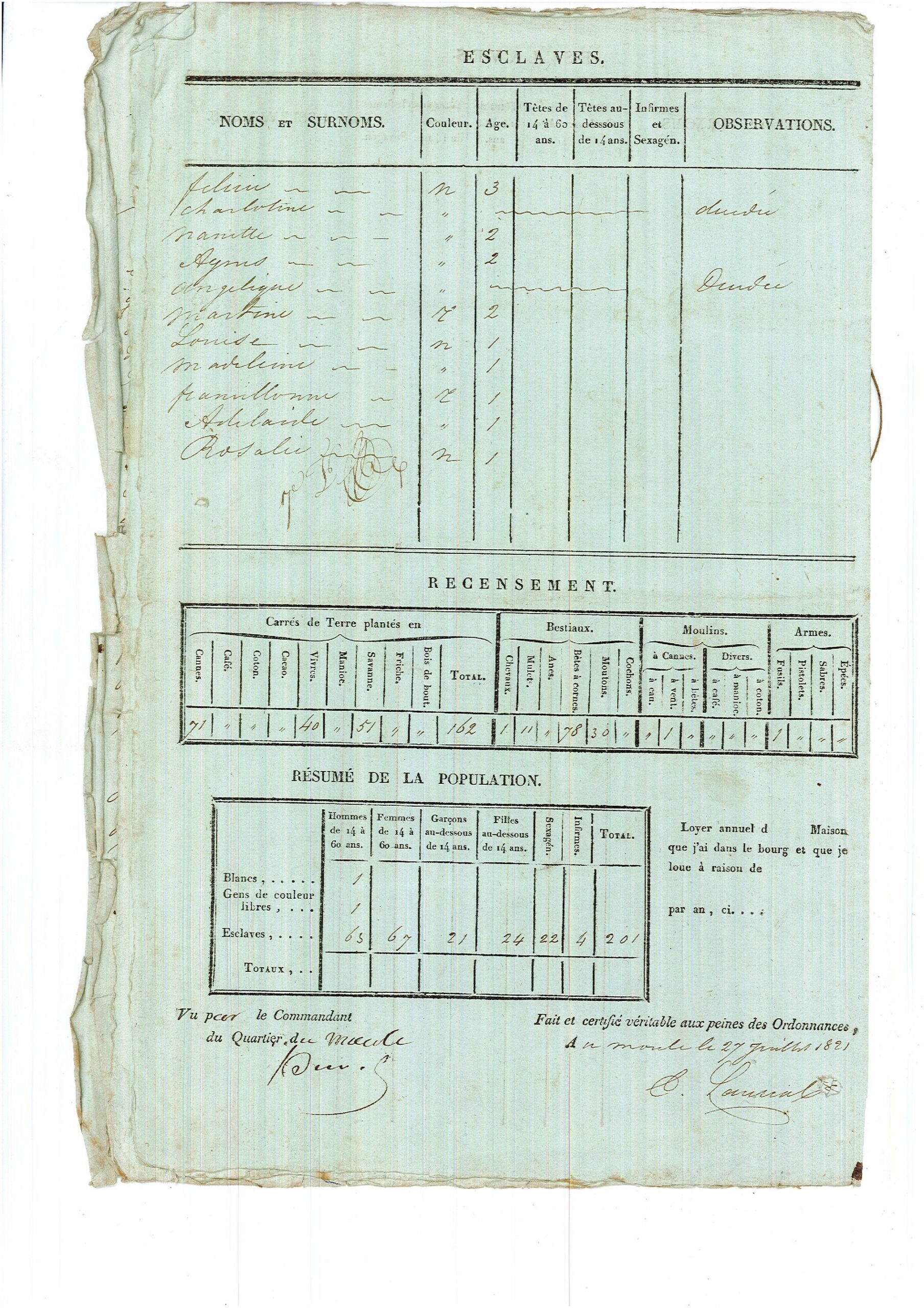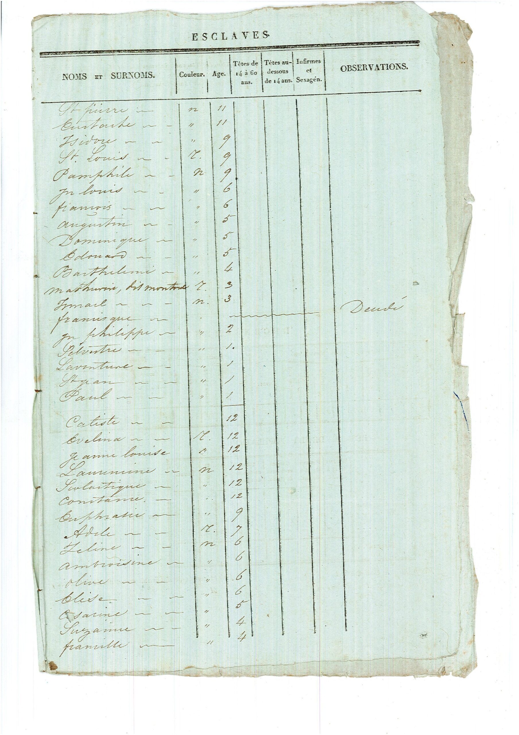 Parmi les archives qui constituent le fonds de l’habitation Boyvin dite Beaumont, il existe un autre document, moins spectaculaire que le plan parcellaire de 1817 (voir le focus précédent) mais tout aussi caractéristique du régime servile. Cette pièce est purement administrative, parfaitement anodine au sein d’une société coloniale fondée sur l’esclavage mais elle est aujourd’hui d’une réelle rareté aux Antilles car ces pièces n’ont pas été conservées sous cette forme. Il s’agit d’un dénombrement d’esclaves, un document que les propriétaires d’esclaves devaient remplir chaque année sur un formulaire spécifique avant de le remettre à l’administration, cette liste permettant ensuite aux autorités de fixer le montant de la contribution due par les détenteurs d’esclaves. Il s’agit d’un impôt de capitation, payé par « tête d’esclave » déclarée.