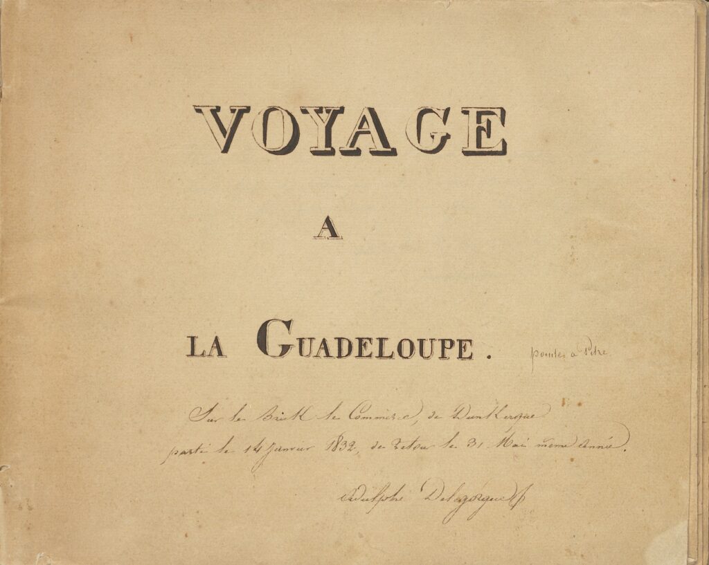 Ce carnet de 52 pages intitulé Voyage à la Guadeloupe est un récit manuscrit du naturaliste Adulphe Delegorgue, rédigé en 1832. Il contient une description de la Guadeloupe plus de quinze ans avant l’abolition de l’esclavage, ainsi qu’une partie consacrée à la culture de la canne et l’histoire naturelle de l’île. On peut lire notamment une description pittoresque de Pointe-à-Pitre : « Les rues de la Pointe-à-pitre sont larges, tirées au cordeau, pavées comme en Europe. La plupart ont des trottoirs. Son port est bordé de belles maisons dont le rez-de-chaussée sert de magasins pour le sel et les cargaisons. On y voit beaucoup d’activité, surtout dans les temps prospères ». Il se termine par la transcription transcription maladroite de chansons créoles.