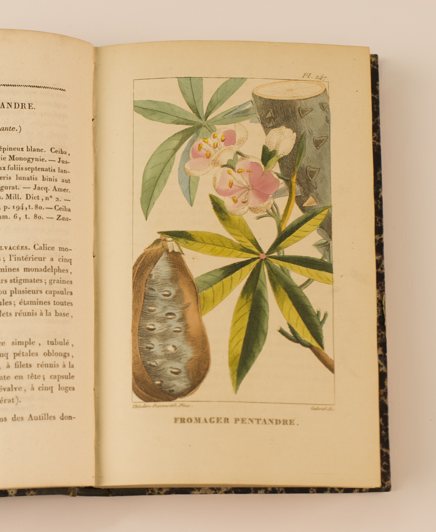 Derrière ces vocables un peu étranges se cachent des noms de plantes des Antilles répertoriées par le botaniste et médecin Michel Etienne Descourtil. Publié en 1833, son ouvrage intitulé « Flore pittoresque et médicale des Antilles ou traité des plantes usuelles des colonies françaises, espagnoles, portugaises » devait initialement ne s’intéresser qu’aux plantes médicinales. Mais le naturaliste l’enrichit des plantes ayant une valeur commerciale et l’ouvrage devint un répertoire des espèces connues aux Antilles. Ces deux estampes de couleur sont issues des 600 planches que l’on peut découvrir dans les huit volumes qui composent l’œuvre.