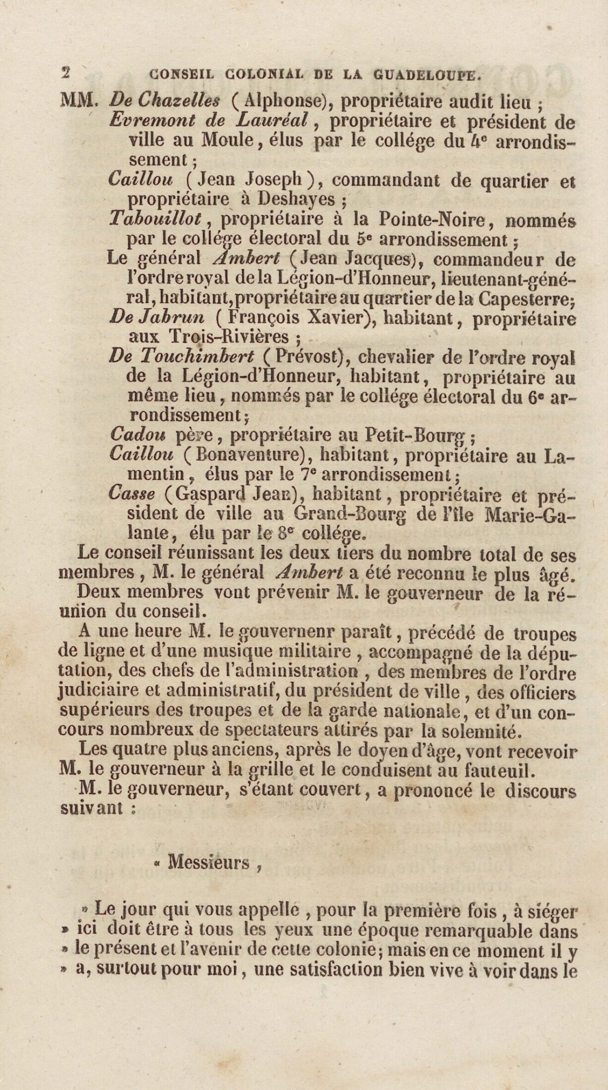 Le 6 janvier 1834 à Basse-Terre, après une messe célébrée par le préfet apostolique en l’église Saint-François, les membres du conseil colonial, la première représentation locale élue en 1833 au suffrage censitaire, se réunissent à l’hôtel du Petit-Gouvernement pour tenir leur session inaugurale. Le lendemain, par 15 voix sur 21 votants, ils choisissent à bulletin secret leur premier président, le général Jean-Jacques d’Ambert. Agé de 69 ans, Ambert est le doyen d’âge de l’assemblée ; après une carrière militaire brillante sous la Révolution, il commande un temps les troupes stationnées à la Guadeloupe où il est également par sa femme un riche propriétaire terrien. A cette époque, le président est renouvelé chaque année et le général d’Ambert préside l’assemblée à plusieurs reprises jusqu’en 1848, et notamment en 1847 quand le conseil colonial se prononce en faveur d’une abolition sous condition de l’esclavage. Il meurt à Saint-Claude le 20 novembre 1851.