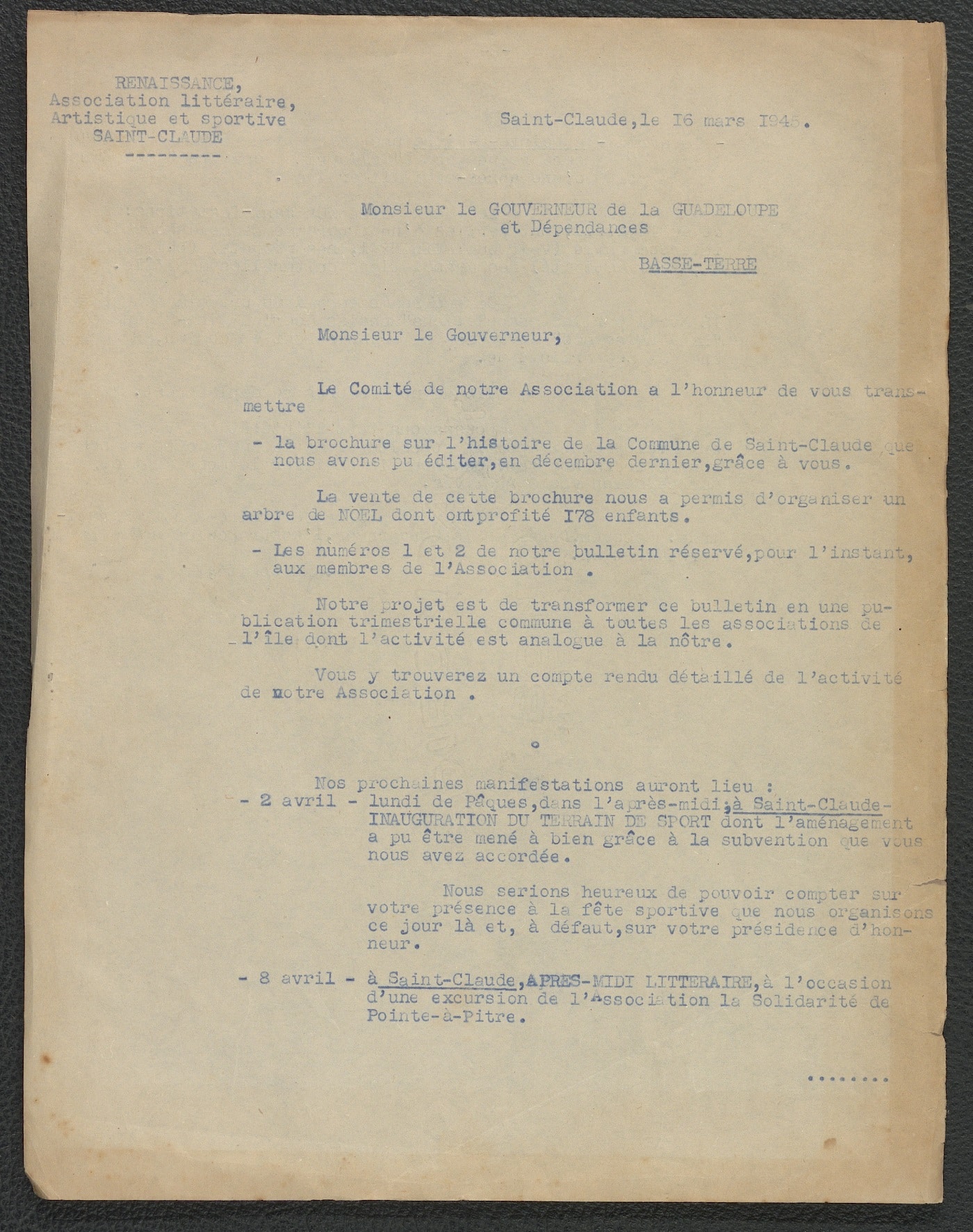 En mars 1945, alors que les alliés livrent leurs derniers combats et avance vers l’Allemagne, l’association artistique, littéraire et sportive Renaissance de Saint-Claude, créée un an plus tôt, présente dans une note son activité au gouverneur.