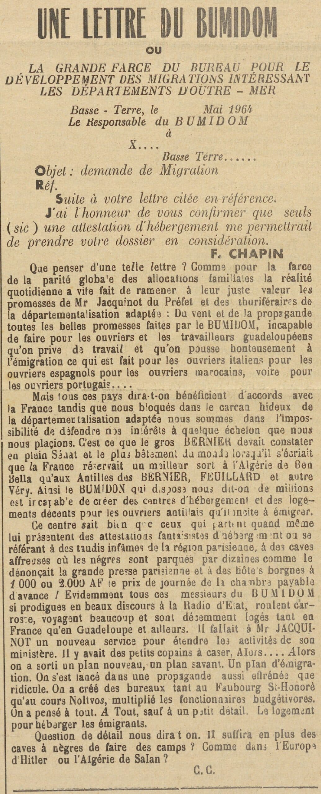 L’hebdomadaire L’Étincelle, organe du parti communiste guadeloupéen, aborde lui aussi régulièrement cette émigration. Le numéro du 18 novembre 1967 rapporte l’intervention du député communiste guadeloupéen Paul Lacavé, le 2 novembre 1967, lors de la discussion sur le budget des DOM. Il y critique le dispositif du BUMIDOM qui, selon-lui, n’est pas une nécessité, « mais une catastrophe » et interpelle l’assemblée en ces termes : « Parmi les milliers d’émigrés qui arrivent en France, combien bénéficient d’une formation professionnelle véritable ? Combien peuplent les bidonvilles des banlieues parisiennes, les caves de Clignancourt et de Montreuil ? »
