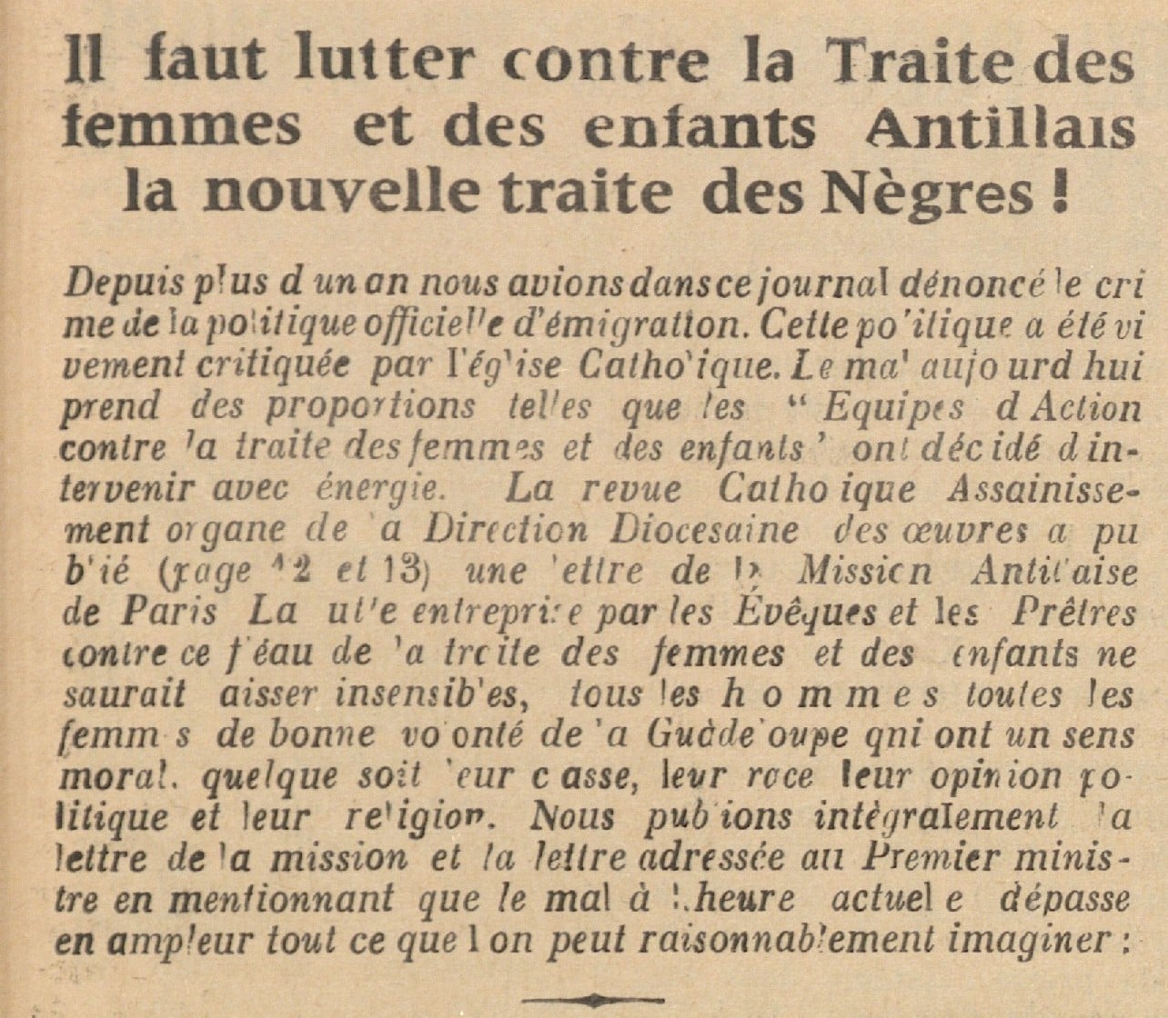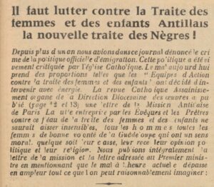 Plus tard, Le Progrès social relaie plusieurs textes du père Bocquillon, aumônier de la Mission antillaise à Paris et l’une des incarnations de l’opposition au BUMIDOM. En autres articles, signalons en 1965 : « Il faut lutter contre la traite des femmes et des enfants antillais, la nouvelle traite des nègres ».